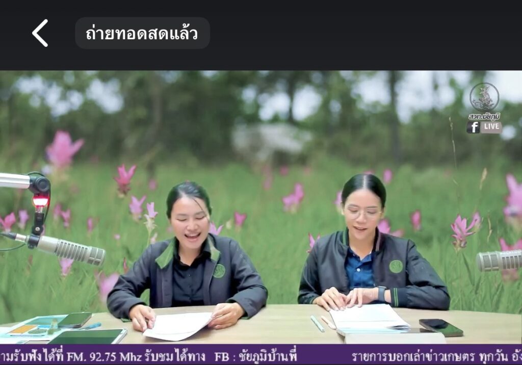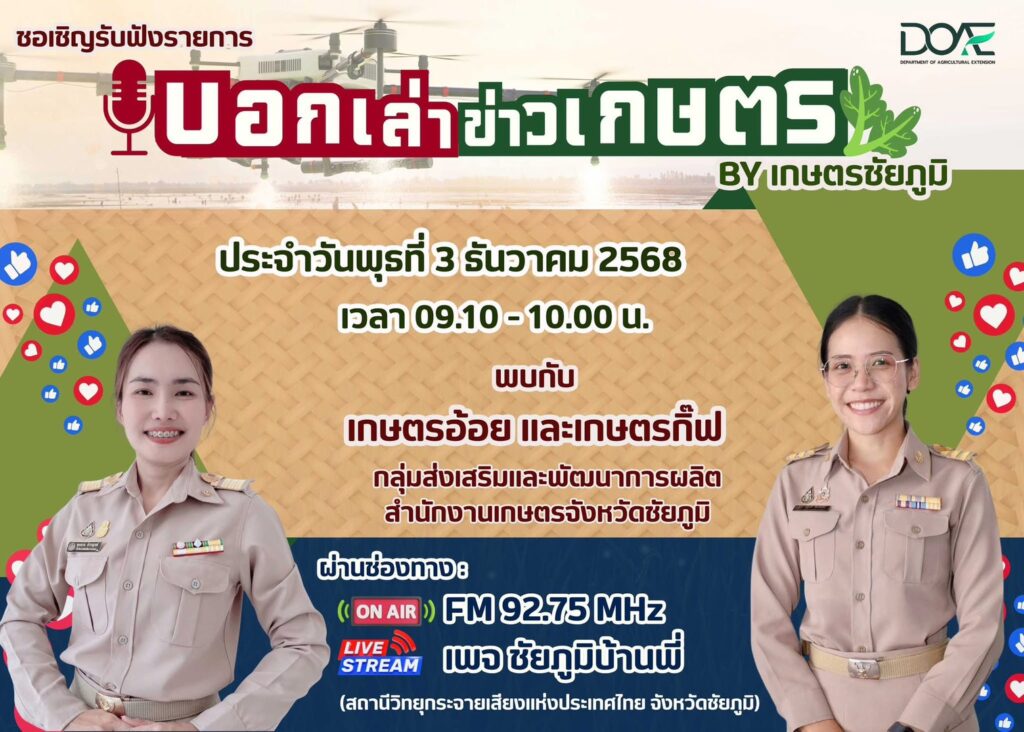 นางสาวกังสดาล ชาตกุล มอบหมายให้นางสาวพุทธชาด สำราญวงษ์ นักวิชาการส่งเสริมการเกษตรชำนาญการ และนางสาวธิษลิณณ์ ชัยเสนสุข นักวิชาการส่งเสริมการเกษตรปฏิบัติการ ร่วมจัดรายการวิทยุรายการ”บอกเล่า ข่าวเกษตร” เพื่อประชาสัมพันธ์ผลการปฏิบัติงานและข่าวสารด้านงานส่งเสริมการเกษตร ของสำนักงานเกษตรจังหวัดชัยภูมิ โดยประชาสัมพันธ์การขึ้นทะเบียนเครื่องจักรกลการเกษตร การให้น้ำแก่พืช การเตรียมความพร้อมรับมือต่อการเปลี่ยนแปลงสภาพภูมิอากาศ โรคและแมลงศัตรูพืชที่ต้องระวังในฤดูหนาว ณ สถานีวิทยุกระจายเสียงแห่งประเทศไทยจังหวัดชัยภูมิ คลื่น FM 92.75 เมกะเฮิรตซ์