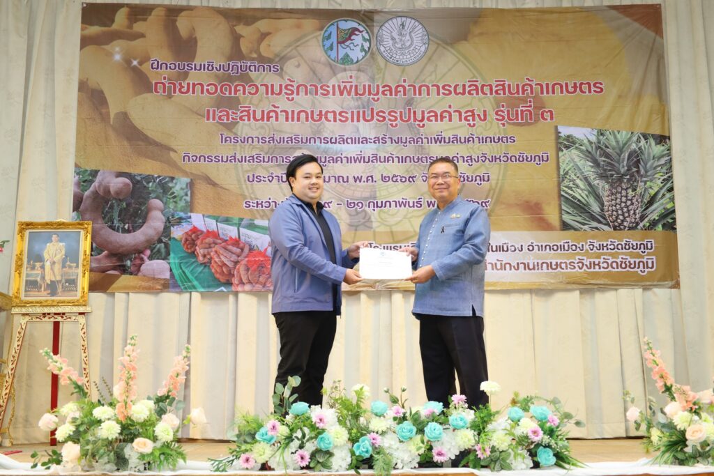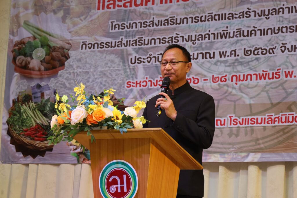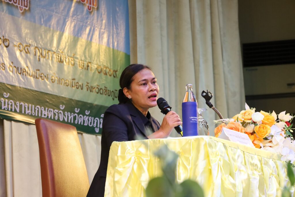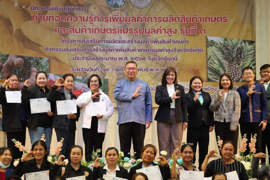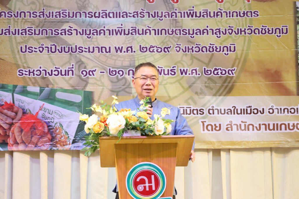 นางสาวกานต์จรัส เอียดทองใส รองผู้ว่าราชการจังหวัดชัยภูมิ เป็นประธานพิธีเปิดการอบรมเชิงปฏิบัติการถ่ายทอดความรู้การเพิ่มมูลค่าการผลิตสินค้าเกษตรและสินค้าเกษตรแปรรูปมูลค่าสูง รุ่นที่ 1 – 5 กิจกรรมส่งเสริมการสร้างมูลค่าเพิ่มสินค้าเกษตรมูลค่าสูงจังหวัดชัยภูมิ โครงการส่งเสริมการผลิตและสร้างมูลค่าเพิ่มสินค้าเกษตร ประจำปีงบประมาณ พ.ศ. 2569 ณ โรงแรมเลิศนิมิตร อำเภอเมือง จังหวัดชัยภูมิ ระหว่างวันที่ 12 – 28 กุมภาพันธ์ 2569 เพื่อส่งเสริมให้เกษตรกรมีความรู้ ทักษะ ประสบการณ์ การสร้างมูลค่าเพิ่มผลผลิตทางการเกษตรและเกษตรแปรรูป สร้างรายได้แก่ครัวเรือนเกษตรกร ยกระดับกระบวนการผลิตทางการเกษตรด้วยเทคโนโลยีและนวัตกรรมสมัยใหม่สู่สินค้าเกษตรมูลค่าสูงโดยการฝึกอบรมหลักสูตรดังกล่าวมุ่งเน้นการสร้างความรู้ความเข้าใจการผลิตสินค้าเกษตรมูลค่าสูงภายใต้สภาพการเปลี่ยนแปลงของภูมิอากาศ แนวคิดในการสร้างมูลค่าเพิ่มสินค้าเกษตร การพัฒนามาตรฐานการผลิต การแปรรูปสินค้าเกษตร การพัฒนาบรรจุภัณฑ์ และการสร้างแบรนด์ การตลาดสินค้าเกษตร และการเชื่อมโยงการท่องเที่ยว