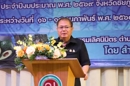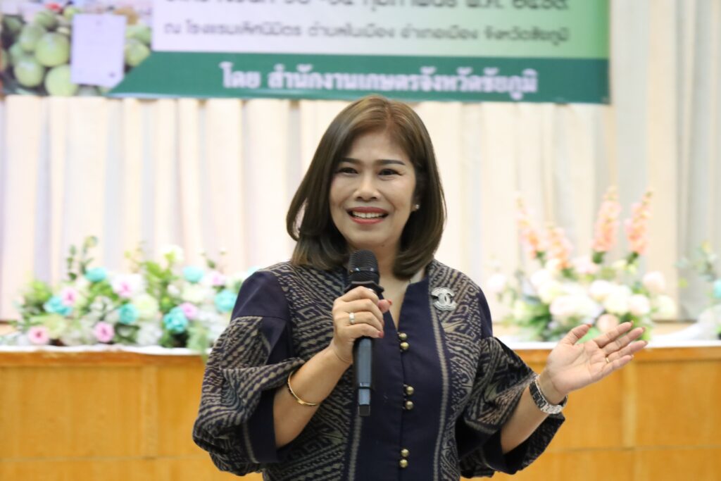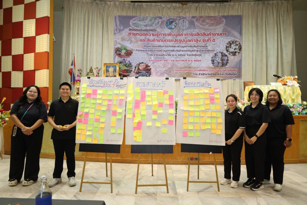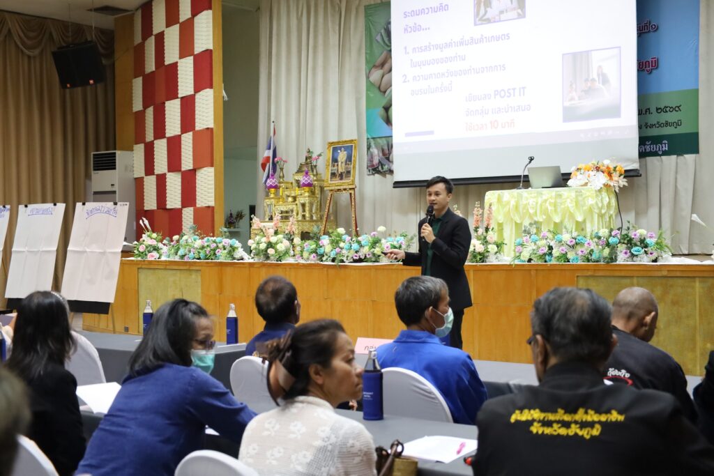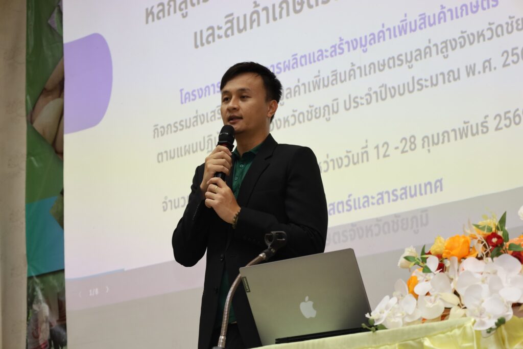 นางสาวกานต์จรัส เอียดทองใส รองผู้ว่าราชการจังหวัดชัยภูมิ เป็นประธานพิธีเปิดการอบรมเชิงปฏิบัติการถ่ายทอดความรู้การเพิ่มมูลค่าการผลิตสินค้าเกษตรและสินค้าเกษตรแปรรูปมูลค่าสูง รุ่นที่ 1 – 5 กิจกรรมส่งเสริมการสร้างมูลค่าเพิ่มสินค้าเกษตรมูลค่าสูงจังหวัดชัยภูมิ โครงการส่งเสริมการผลิตและสร้างมูลค่าเพิ่มสินค้าเกษตร ประจำปีงบประมาณ พ.ศ. 2569 ณ โรงแรมเลิศนิมิตร อำเภอเมือง จังหวัดชัยภูมิ ระหว่างวันที่ 12 – 28 กุมภาพันธ์ 2569 เพื่อส่งเสริมให้เกษตรกรมีความรู้ ทักษะ ประสบการณ์ การสร้างมูลค่าเพิ่มผลผลิตทางการเกษตรและเกษตรแปรรูป สร้างรายได้แก่ครัวเรือนเกษตรกร ยกระดับกระบวนการผลิตทางการเกษตรด้วยเทคโนโลยีและนวัตกรรมสมัยใหม่สู่สินค้าเกษตรมูลค่าสูงโดยการฝึกอบรมหลักสูตรดังกล่าวมุ่งเน้นการสร้างความรู้ความเข้าใจการผลิตสินค้าเกษตรมูลค่าสูงภายใต้สภาพการเปลี่ยนแปลงของภูมิอากาศ แนวคิดในการสร้างมูลค่าเพิ่มสินค้าเกษตร การพัฒนามาตรฐานการผลิต การแปรรูปสินค้าเกษตร การพัฒนาบรรจุภัณฑ์ และการสร้างแบรนด์ การตลาดสินค้าเกษตร และการเชื่อมโยงการท่องเที่ยว