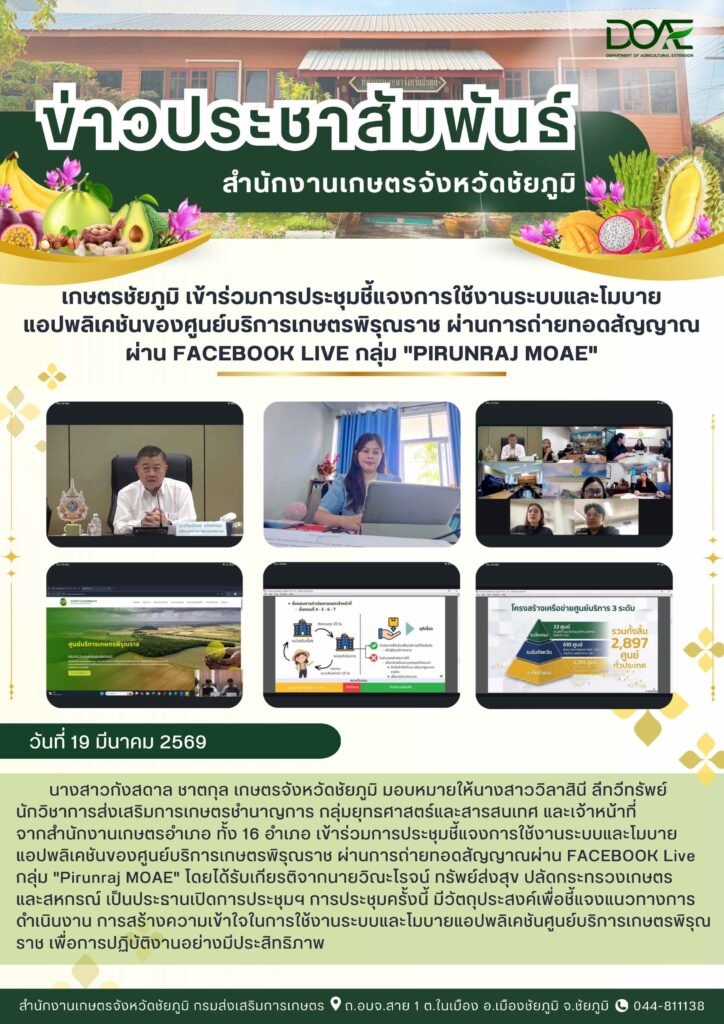 เกษตรชัยภูมิ เข้าร่วมการประชุมชี้แจงการใช้งานระบบและโมบายแอปพลิเคชันของศูนย์บริการเกษตรพิรุณราช ผ่านการถ่ายทอดสัญญาณผ่าน FACEBOOK Live กลุ่ม “Pirunraj MOAE”