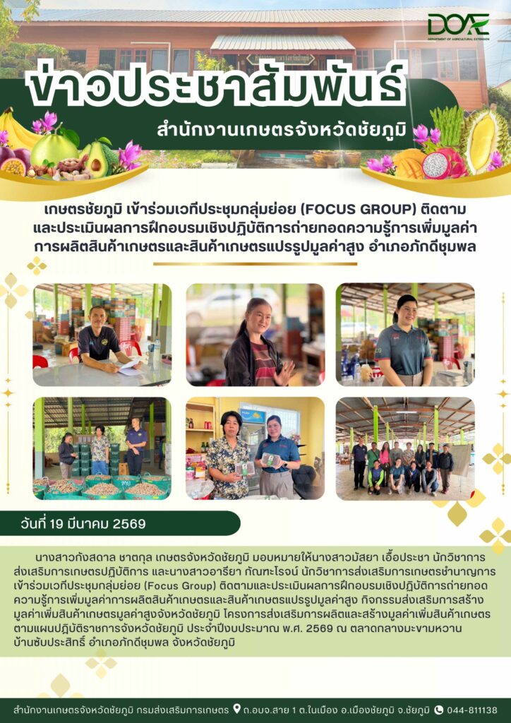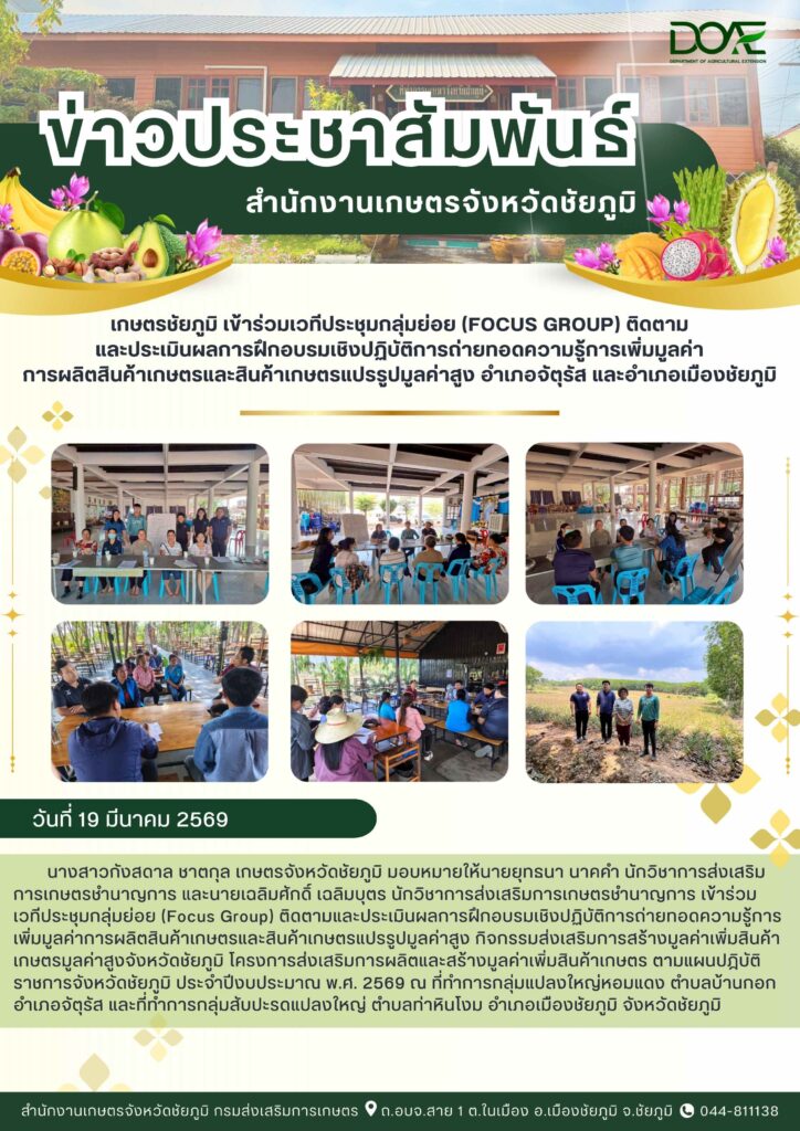 วันที่ 19 มีนาคม 2569 นางสาวกังสดาล ชาตกุล เกษตรจังหวัดชัยภูมิ มอบหมายให้นางสาววิลาสินี ลีทวีทรัพย์ …