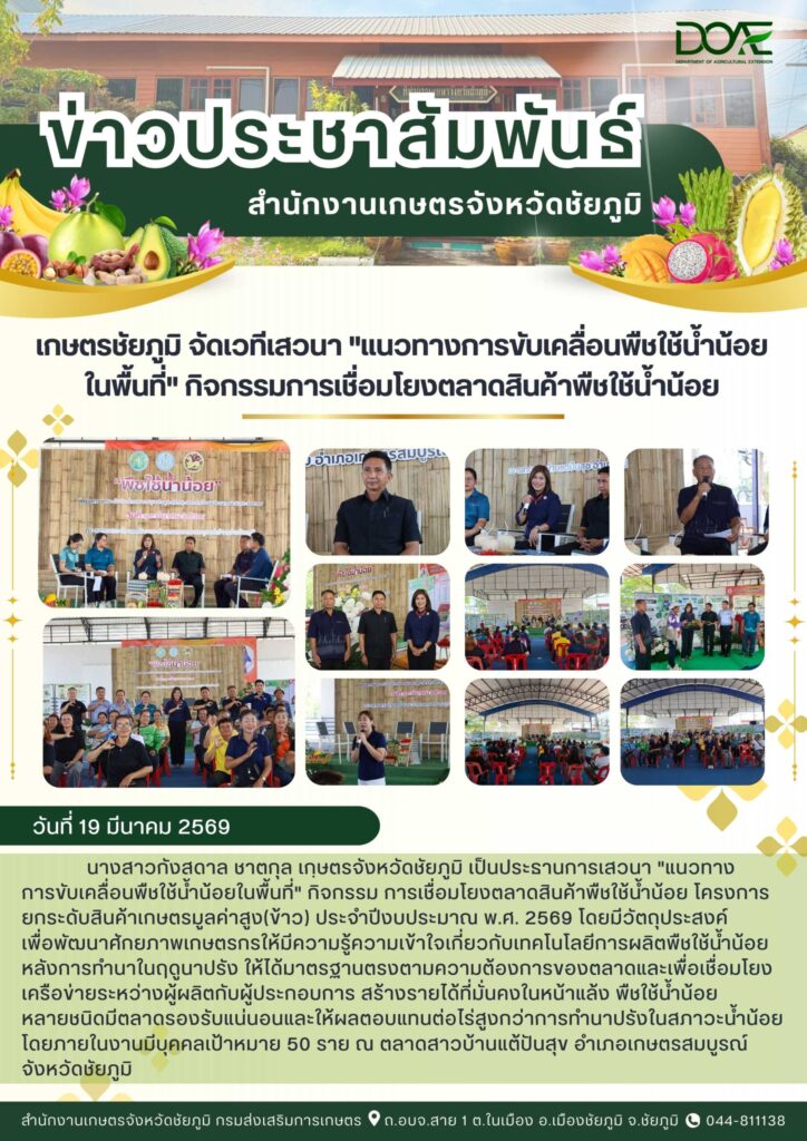 เกษตรชัยภูมิ จัดเวทีเสวนา “แนวทางการขับเคลื่อนพืชใช้น้ำน้อยในพื้นที่” กิจกรรมการเชื่อมโยงตลาดสินค้าพืชใช้น้ำน้อย