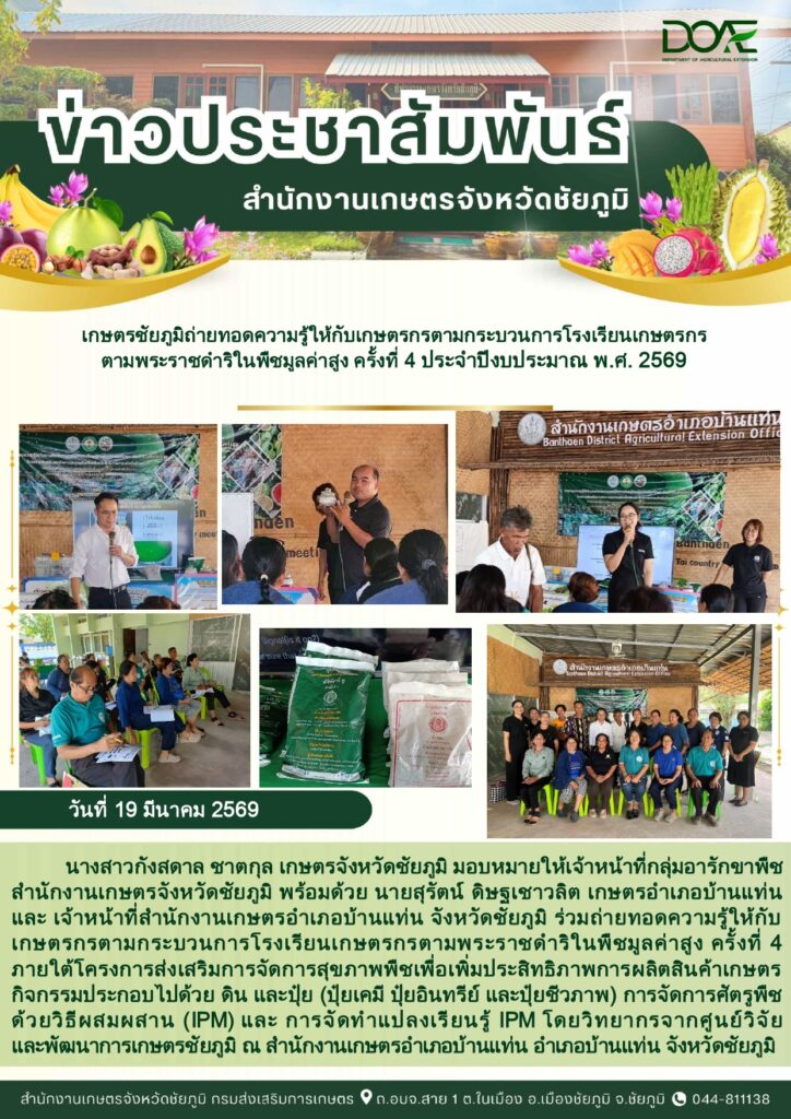 เกษตรชัยภูมิ ร่วมถ่ายทอดความรู้ให้กับเกษตรกรตามกระบวนการโรงเรียนเกษตรกรตามพระราชดำริในพืชมูลค่าสูง ครั้งที่ 4