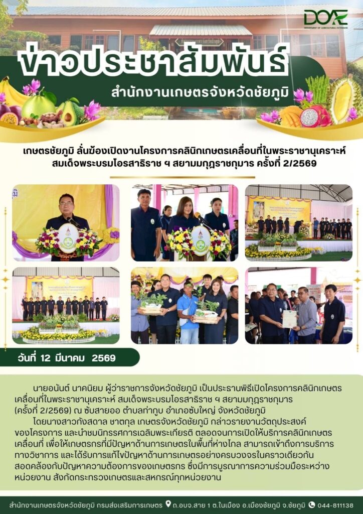 จังหวัดชัยภูมิ ลั่นฆ้องเปิดงานโครงการคลินิกเกษตรเคลื่อนที่ในพระราชานุเคราะห์ สมเด็จพระบรมโอรสาธิราช ฯ สยามมกุฎราชกุมาร ครั้งที่ 2/2569