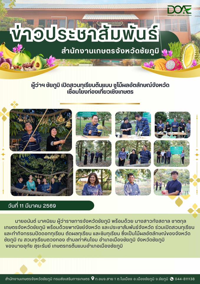 ผู้ว่าฯ ชัยภูมิ เปิดสวนทุเรียนต้นแบบ ชูไม้ผลอัตลักษณ์จังหวัด เชื่อมโยงท่องเที่ยวเชิงเกษตร