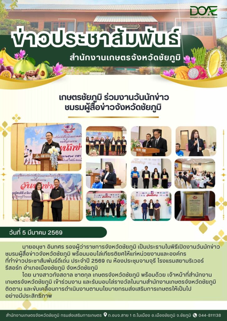 วันที่ 5 มีนาคม 2569 นางสาวกังสดาล ชาตกุล เกษตรจังหวัดชัยภูมิ มอบหมายให้ นางสาวอารียา กัณฑะโรจน์ นัก…