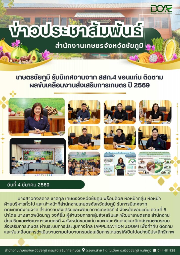 วันที่ 4 มีนาคม 2569 นางสาวกังสดาล ชาตกุล เกษตรจังหวัดชัยภูมิ พร้อมด้วย หัวหน้ากลุ่ม หัวหน้าฝ่ายบริห…