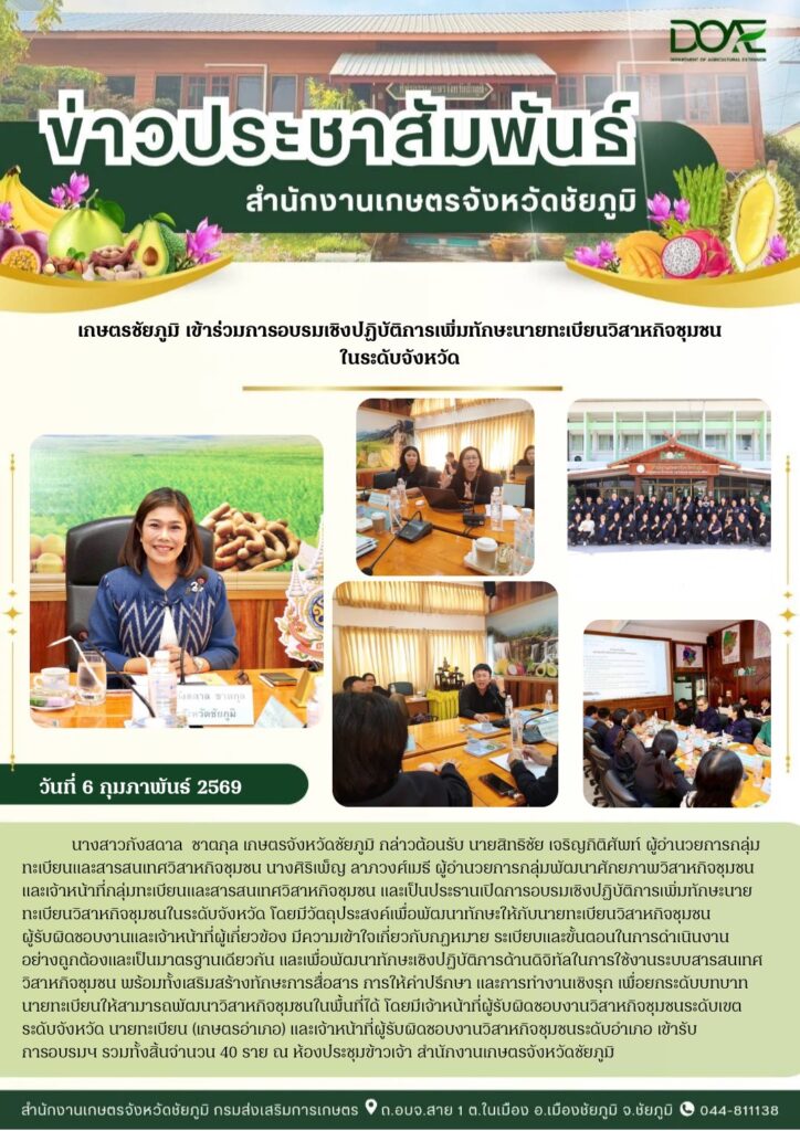 วันที่ 4 กุมภาพันธ์ 2569 นางสาวกังสดาล ชาตกุล เกษตรจังหวัดชัยภูมิ เป็นประธานเปิดการอบรมถ่ายทอดความรู…