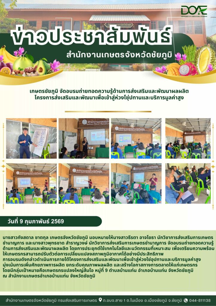 วันที่ 9 กุมภาพันธ์ 2569 นางสาวกังสดาล ชาตกุล เกษตรจังหวัดชัยภูมิ มอบหมายให้นางสาวธีรตา อาจโยธา นักว…