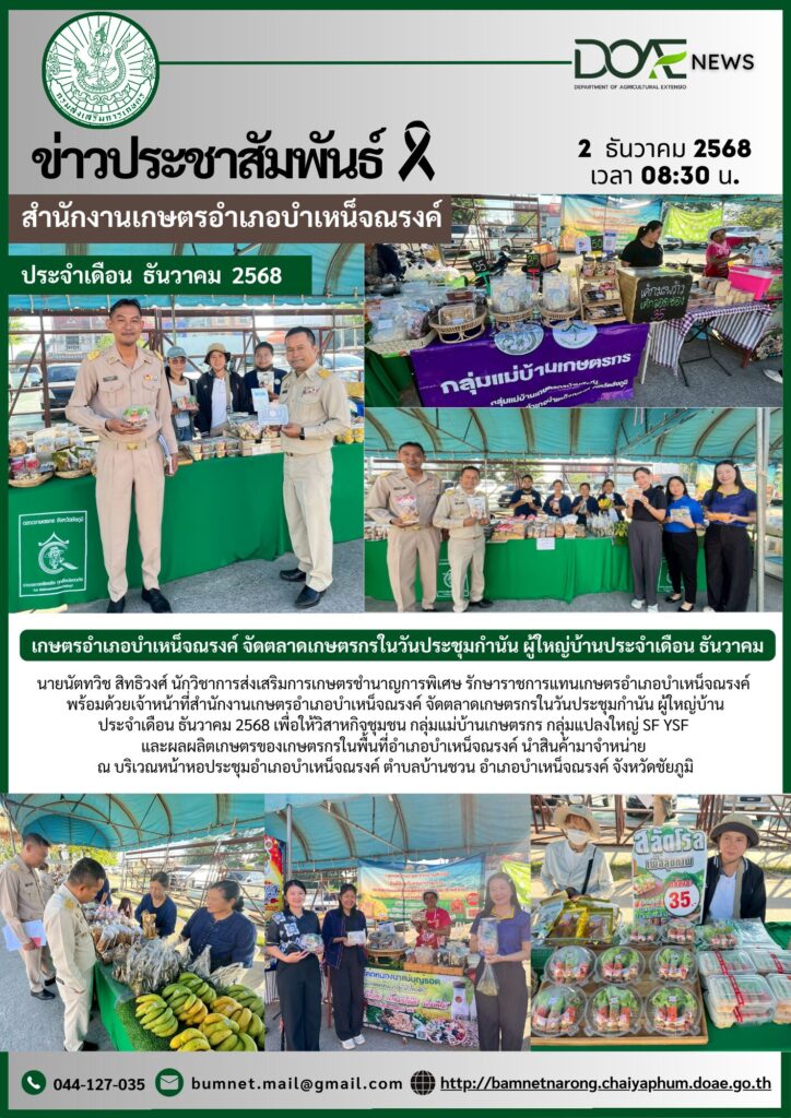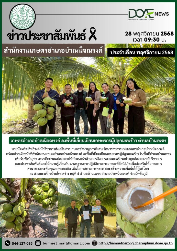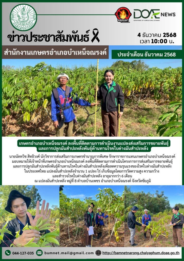 พระพันปี6+3ทบกวสช ข่าวส่งเสริมการเกษตรข่างประกาศ/แจ้งเตือนข่าวทั้งหมด เกษตรอำเภอบำเหน็จณรงค์ จัดตลาดเกษตรกรในวันประชุมกำนัน ผู้ใหญ่บ้านประจำเดือน ธันวาคม ลงพื้นที่ติดตามการดำเนินงานแปลงส่งเสริมการขยายพันธุ์ ลงพื้นที่เยี่ยมเยียนเกษตรกรผู้ปลูกมะพร้าว ตำบลบ้านเพชร เกษตรอำเภอบำเหน็จณรงค์ ลงพื้นที่ติดตามและสนับสนุนการจัดการเศษวัสดุทางการเกษตร หลังฤดูการเก็บเกี่ยว แจ้งเตือนการระบาด “หนอนกอข้าว” แจ้งเตือนการระบาดของโรคราน้ำค้าง รายงานราคาสินค้าเกษตร ณ ไร่นาประจำสัปดาห์ที่ 1 เดือนธันวาคม 2568 แจ้งเตือนการระบาด เฝ้าระวัง “โรคตายพรายในกล้วย” เกษตรอำเภอบำเหน็จณรงค์ จัดตลาดเกษตรกรในวันประชุมกำนัน ผู้ใหญ่บ้านประจำเดือน ธันวาคม ลงพื้นที่ติดตามการดำเนินงานแปลงส่งเสริมการขยายพันธุ์ แจ้งเตือนการระบาด “หนอนกอข้าว” แจ้งเตือนการระบาดของโรคราน้ำค้าง 1 2 Next » ศพก.บำเหน็จณรงค์ แปลงใหญ่หอมแดง บำเหน็จณรงค์ สวนมะพร้าว บำเหน็จณรงค์