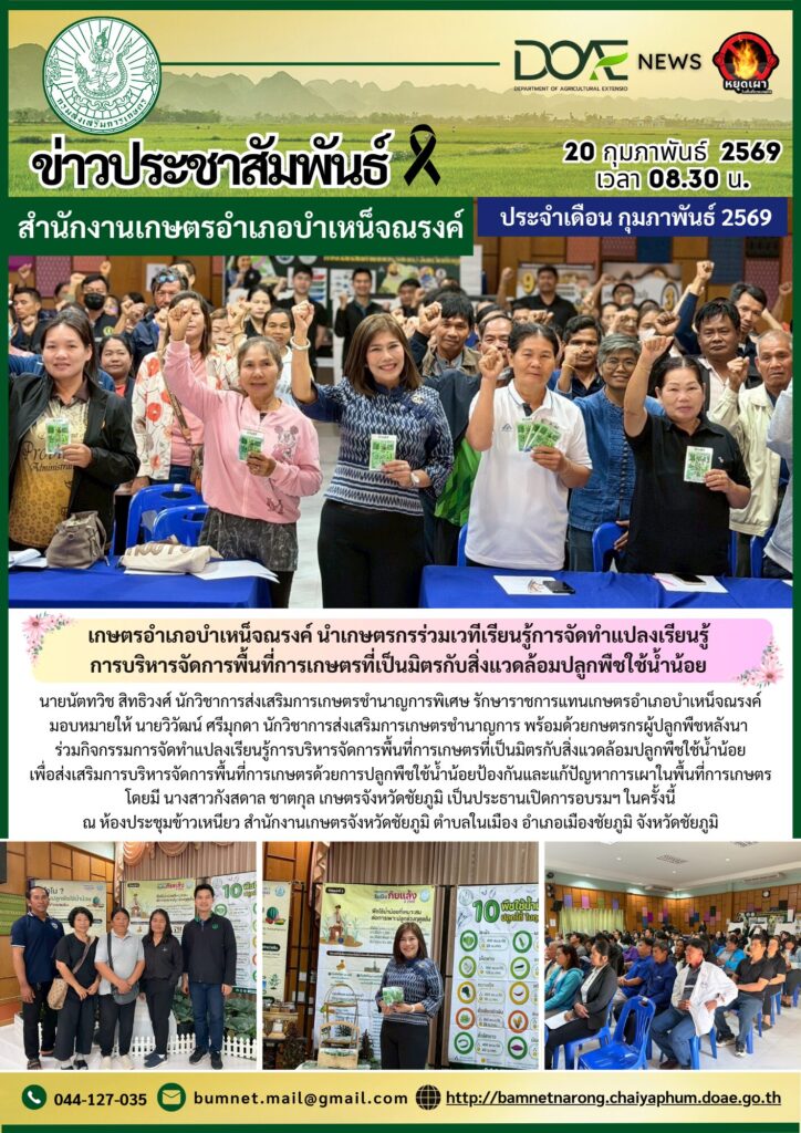 เกษตรอำเภอบำเหน็จณรงค์ นำเกษตรกรร่วมเวทีเรียนรู้การจัดทำแปลงเรียนรู้ การบริหารจัดการพื้นที่การเกษตรที่เป็นมิตรกับสิ่งแวดล้อมปลูกพืชใช้น้ำน้อย