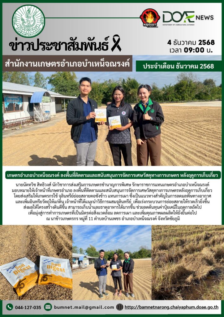 นายนัตทวิช สิทธิวงศ์ นักวิชาการส่งเสริมการเกษตรชำนาญการพิเศษ รักษาราชการแทนเกษตรอำเภอบำเหน็จณรงค์มอบหมายให้เจ้าหน้าที่เกษตรอำเภอ ลงพื้นที่ติดตามและสนับสนุนการจัดการเศษวัสดุทางการเกษตรหลังฤดูการเก็บเกี่ยวโดยส่งเสริมให้เกษตรกรใช้ จุลินทรีย์ย่อยสลายตอซังข้าว แทนการเผา ซึ่งเป็นแนวทางสำคัญในการลดมลพิษทางอากาศและเพิ่มอินทรียวัตถุให้แก่ดิน เจ้าหน้าที่ได้แนะนำวิธีการผสมจุลินทรีย์ เพื่อเร่งกระบวนการย่อยสลายให้รวดเร็วยิ่งขึ้นส่งผลให้โครงสร้างดินดีขึ้น สามารถเก็บน้ำและธาตุอาหารได้มากขึ้น ช่วยลดต้นทุนค่าปุ๋ยเคมีในฤดูกาลถัดไปเพื่อมุ่งสู่การทำการเกษตรที่เป็นมิตรต่อสิ่งแวดล้อม ลดการเผา และเพิ่มคุณภาพผลผลิตให้ยั่งยืนต่อไป ณ นาข้าวเกษตรกร หมู่ที่ 11 ตำบลบ้านเพชร อำเภอบำเหน็จณรงค์ จังหวัดชัยภูมิ