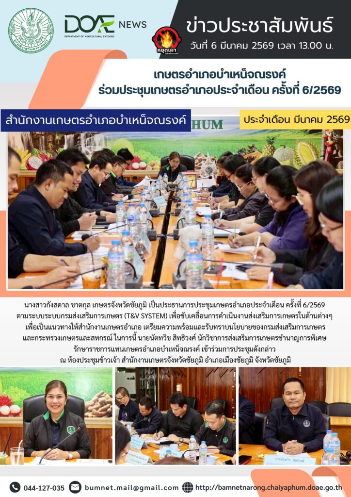 📅 วันที่ 6 มีนาคม 2569 ⏰ เวลา 13.00 น. ⭐ นางสาวกังสดาล ชาตกุล เกษตรจังหวัดชัยภูมิ เป็นประธานการประชุ…