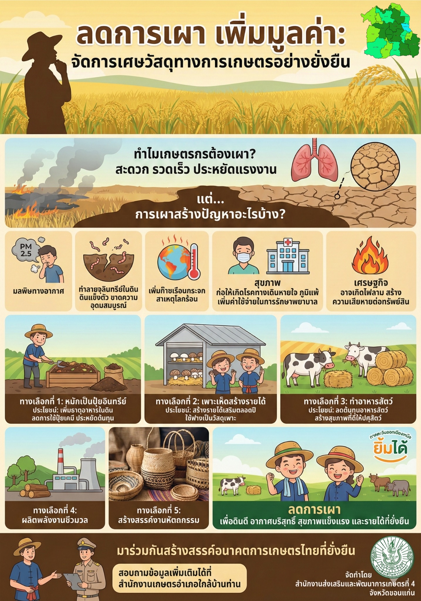 สสก.ที่ 4 ขอนแก่น รณรงค์ “ลดการเผา เพิ่มมูลค่า” เดินหน้าจัดการเศษวัสดุทางการเกษตรอย่างยั่งยืน เพื่อแก้ไขปัญหามลพิษทางอากาศจากการเผาในพื้นที่เกษตร และส่งเสริมให้เกษตรกรนำเศษวัสดุเหลือใช้ทางการเกษตรกลับมาใช้ประโยชน์อย่างคุ้มค่าและยั่งยืน