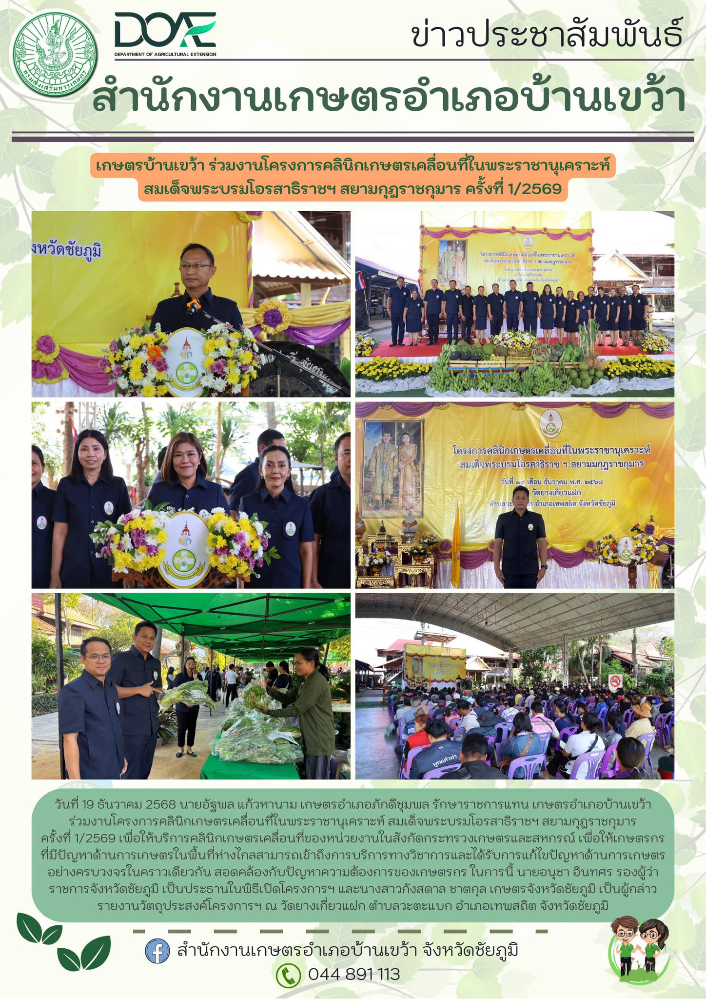 “วันที่ 19 ธันวาคม 2568 นายอัฐพล แก้วหานาม เกษตรอำเภอภักดีชุมพล รักษาราชการแทน เกษตรอำเภอบ้านเขว้าร่วมงานโครงการคลินิกเกษตรเคลื่อนที่ในพระราชานุเคราะห์ สมเด็จพระบรมโอรสาธิราชฯ สยามกุฎราชกุมารครั้งที่ 1/2569 เพื่อให้บริการคลินิกเกษตรเคลื่อนที่ของหน่วยงานในสังกัดกระทรวงเกษตรและสหกรณ์ เพื่อให้เกษตรกรที่มีปัญหาด้านการเกษตรในพื้นที่ห่างไกลสามารถเข้าถึงการบริการทางวิชาการและได้รับการแก้ไขปัญหาด้านการเกษตรอย่างครบวงจรในคราวเดียวกัน สอดคล้องกับปัญหาความต้องการของเกษตรกร ในการนี้ นายอนุชา อินทศร รองผู้ว่าราชการจังหวัดชัยภูมิ เป็นประธานในพิธีเปิดโครงการฯ และนางสาวกังสดาล ชาตกุล เกษตรจังหวัดชัยภูมิ เป็นผู้กล่าวรายงานวัตถุประสงค์โครงการฯ ณ วัดยางเกี่ยวแฝก ตำบลวะตะแบก อำเภอเทพสถิต จังหวัดชัยภูมิ”
