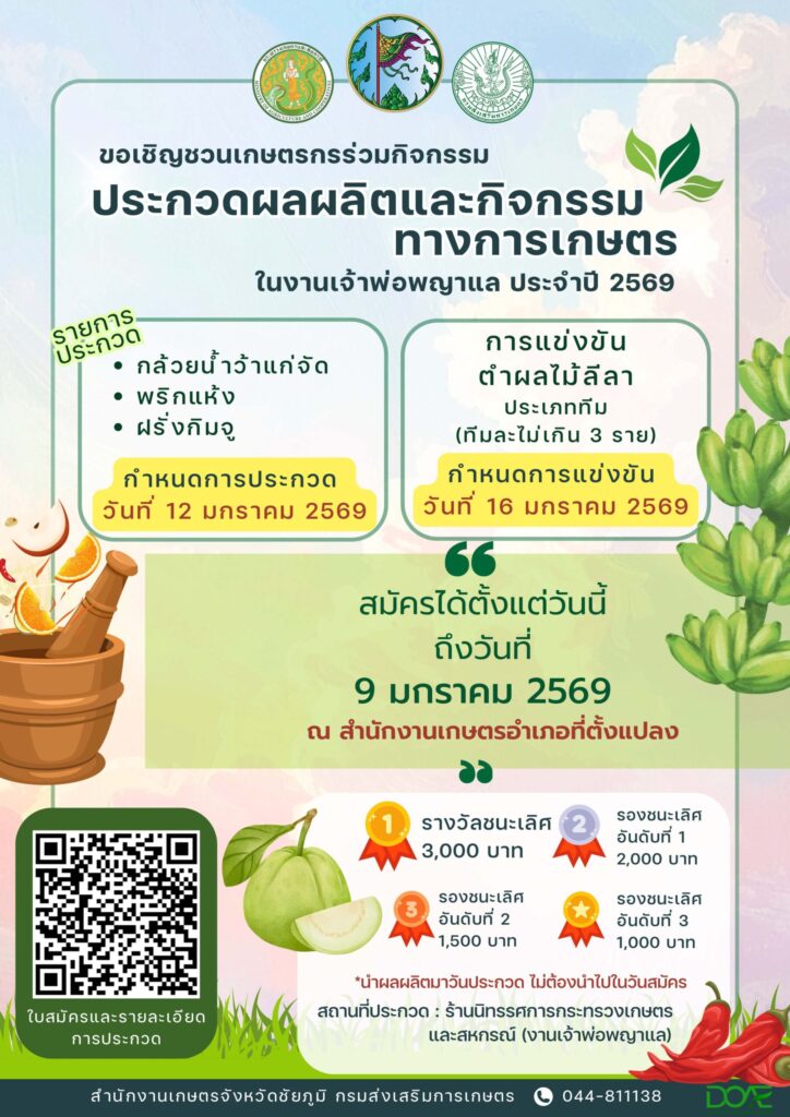 ประกาศผลการประกวดผลผลิตทางการเกษตร งานเจ้าพ่อพญาแล อำเภอแก้งคร้อ ประจำปี 2569