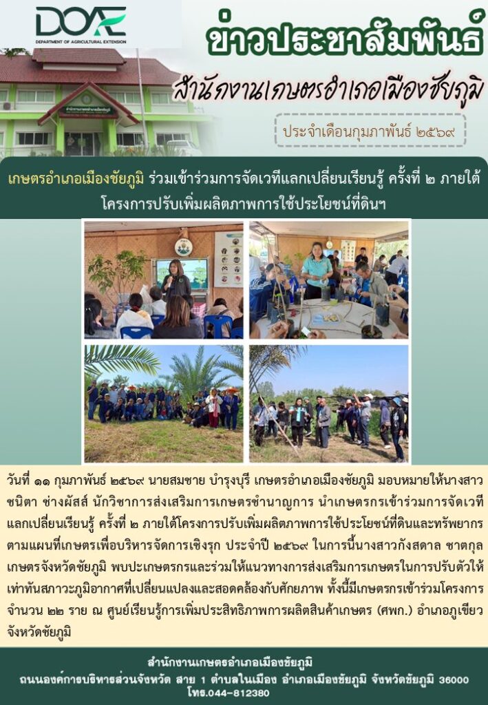 เกษตรอำเภอเมืองชัยภูมิ ร่วมเข้าร่วมการจัดเวทีแลกเปลี่ยนเรียนรู้ ครั้งที่ 2 ภายใต้โครงการปรับเพิ่มผลิตภาพการใช้ประโยชน์ที่ดินและทรัพยากรตามแผนที่เกษตรเพื่อบริหารจัดการเชิงรุก ประจำปี 2569