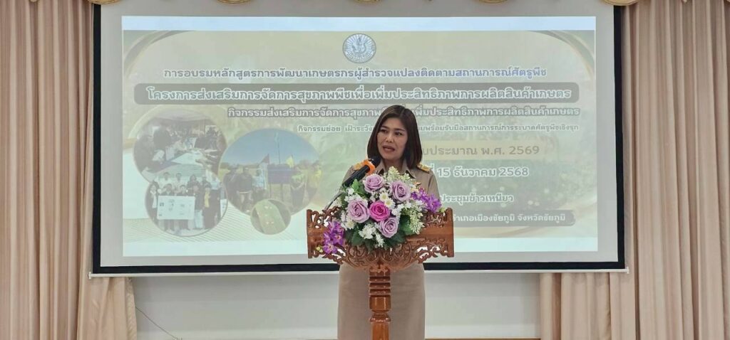 วันที่ 15 ธันวาคม 2568 เวลา 08.30 น. นายปัญญา ใจวังโลก นักวิชาการส่งเสริมการเกษตรชำนาญการ รักษาราชการแทน เกษตรอำเภอภักดีชุมพล มอบหมายให้เจ้าหน้าที่สำนักงานเกษตรอำเภอภักดีชุมพล นำเกษตรกรร่วมอบรมหลักสูตรการพัฒนาเกษตรกรผู้สำรวจแปลงติดตามสถานการณ์ศัตรูพืช เพื่อพัฒนาเกษตรกรผู้สำรวจแปลงติดตามสถานการณ์ศัตรูพืช ด้านการวินิจฉัยศัตรูพืชเบื้องต้น การจำแนกศัตรูพืช/ศัตรูธรรมชาติ การป้องกันศัตรูพืชโดยวิธีผสมผสาน (IPM) การใช้สารเคมีกำจัดศัตรูพืชอย่างถูกต้องและปลอดภัย และการรายงานข้อมูล ณ ห้องประชุมข้าวเหนียว สำนักงานเกษตรจังหวัดชัยภูมิโดยมีนางสาวกังสดาล ชาตกุล เกษตรจังหวัดชัยภูมิ เป็นประธานเปิดการอบรม