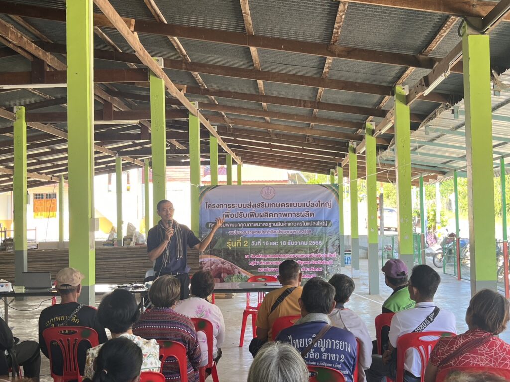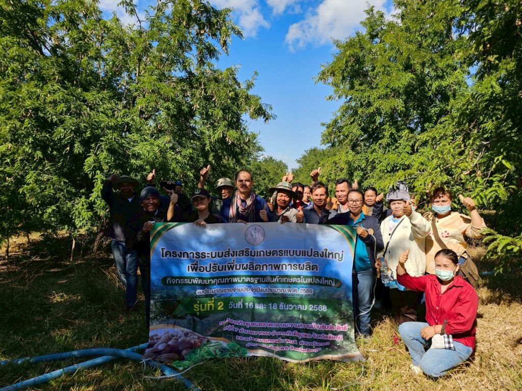 วันที่ 16 และ 18 ธันวาคม 2568 นายปัญญา ใจวังโลก นักวิชาการส่งเสริมการเกษตรชำนาญการ รักษาราชการแทน เกษตรอำเภอภักดีชุมพล พร้อมด้วยเจ้าหน้าที่สำนักงานเกษตรอำเภอภักดีชุมพล ร่วมกับเจ้าหน้าที่สำนักงานเกษตรจังหวัดชัยภูมิ จัดอบรมถ่ายทอดความรู้และนำเกษตรกรฝึกปฏิบัตินอกสถานที่เพื่อพัฒนาเกษตรกรให้มีความรู้ความเข้าใจด้านการผลิตตามระบบมาตรฐาน GAP ภายใต้โครงการระบบส่งเสริมเกษตรแบบแปลงใหญ่เพื่อปรับเพิ่มผลิตภาพการผลิต กิจกรรมพัฒนาคุณภาพมาตรฐานสินค้าเกษตรในแปลงใหญ่ รุ่นที่ 2 ณ วิสาหกิจชุมชนตลาดกลางมะขามหวานบ้านซับประสิทธิ์ หมู่ที่ 7 ตำบลเจาทอง และแปลงมะขามหวานนายทองคำ พิมลี บ้านนาทุ่งใหญ่ หมู่ที่ 7 ตำบลวังทอง อำเภอภักดีชุมพล จังหวัดชัยภูมิ
