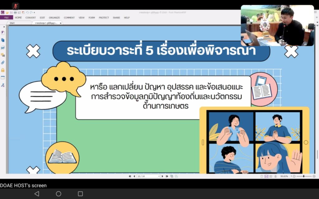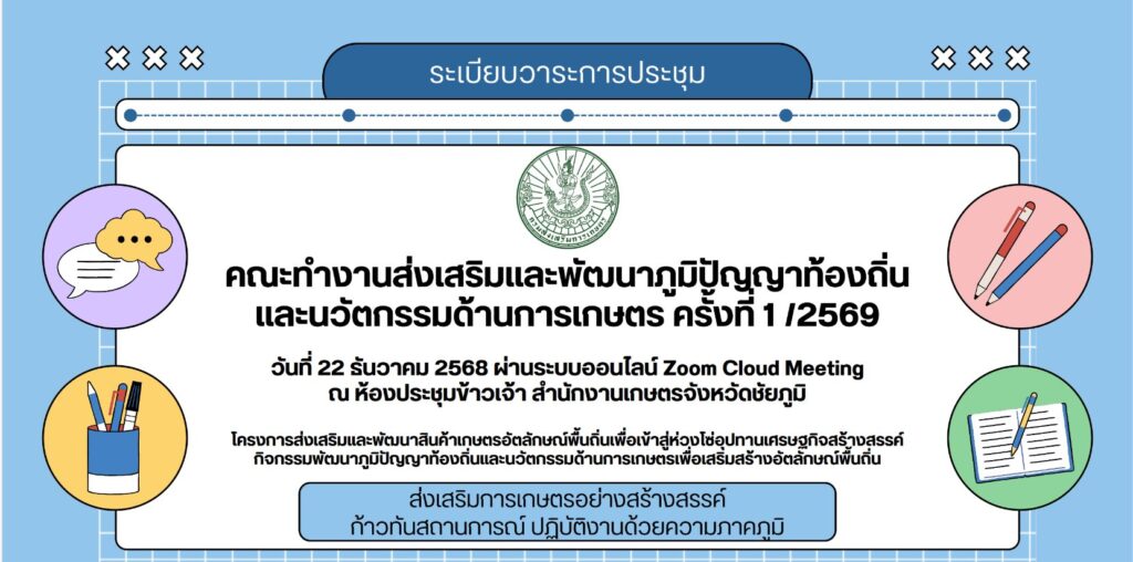 วันที่ 22 ธันวาคม 2568 เวลา 13.30 น. นายปัญญา ใจวังโลก นักวิชาการส่งเสริมการเกษตรชำนาญการ รักษาราชการแทน เกษตรอำเภอภักดีชุมพล มอบหมายให้เจ้าหน้าที่สำนักงานเกษตรอำเภอภักดีชุมพล เข้าร่วมการประชุมคณะทำงานส่งเสริมและพัฒนาภูมิปัญญาท้องถิ่นและนวัตกรรมด้านการเกษตร ครั้งที่ 1/2569 ภายใต้การดำเนินกิจกรรมพัฒนาภูมิปัญญาท้องถิ่นและนวัตกรรมด้านการเกษตรเพื่อเสริมสร้างอัตลักษณ์พื้นถิ่น โครงการส่งเสริมและพัฒนาสินค้าเกษตรอัตลักษณ์พื้นถิ่น เพื่อเข้าสู่ห่วงโซ่อุปทานเศรษฐกิจสร้างสรรค์ เพื่อชี้แจงการดำเนินกิจกรรมสร้างความรู้ ความเข้าใจ และตระหนักถึงความสำคัญในการสำรวจ จัดเก็บและเผยแพร่ ฐานข้อมูลภูมิปัญญาท้องถิ่นและนวัตกรรมด้านการเกษตร ผ่านระบบประชุมออนไลน์ Zoom Meeting โดยมี นางสาวกังสดาล ชาตกุล เกษตรจังหวัดชัยภูมิ เป็นประธานเปิดการประชุม