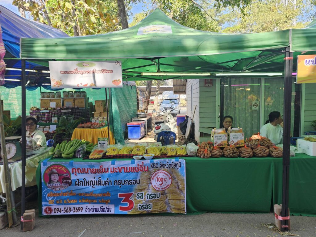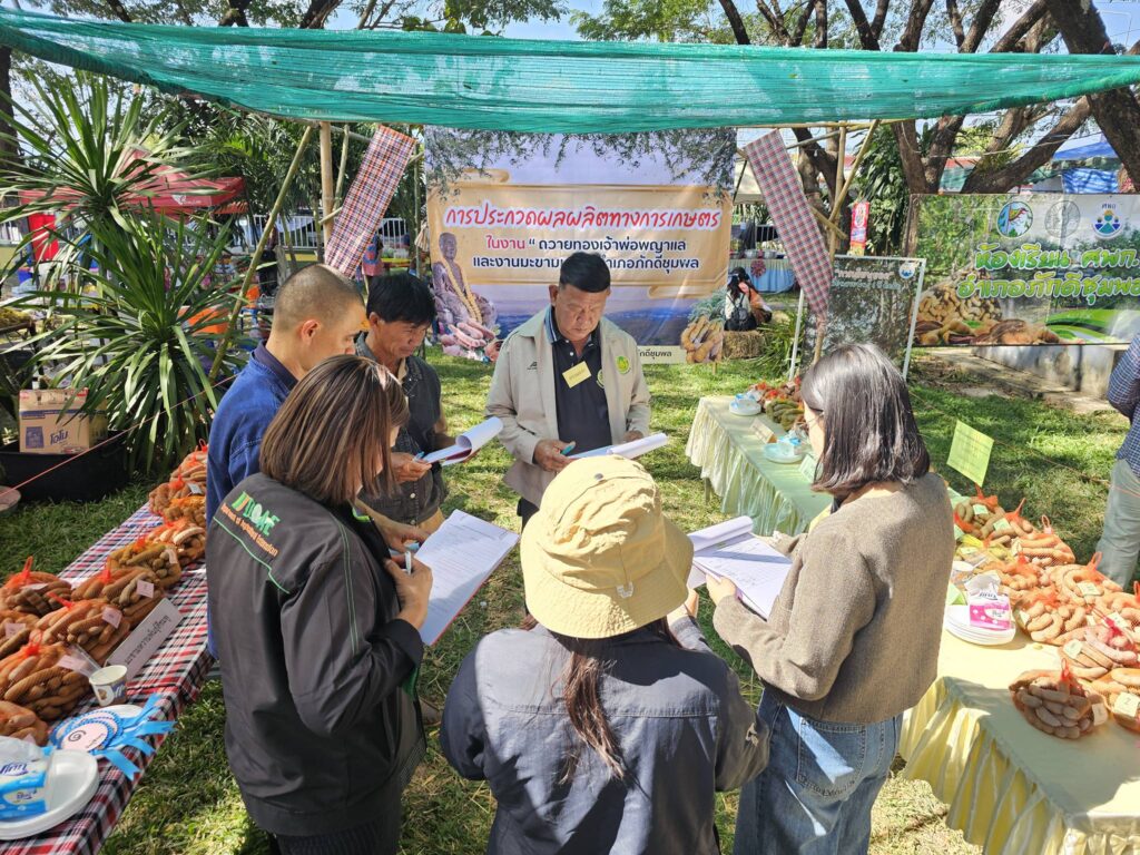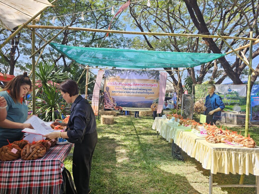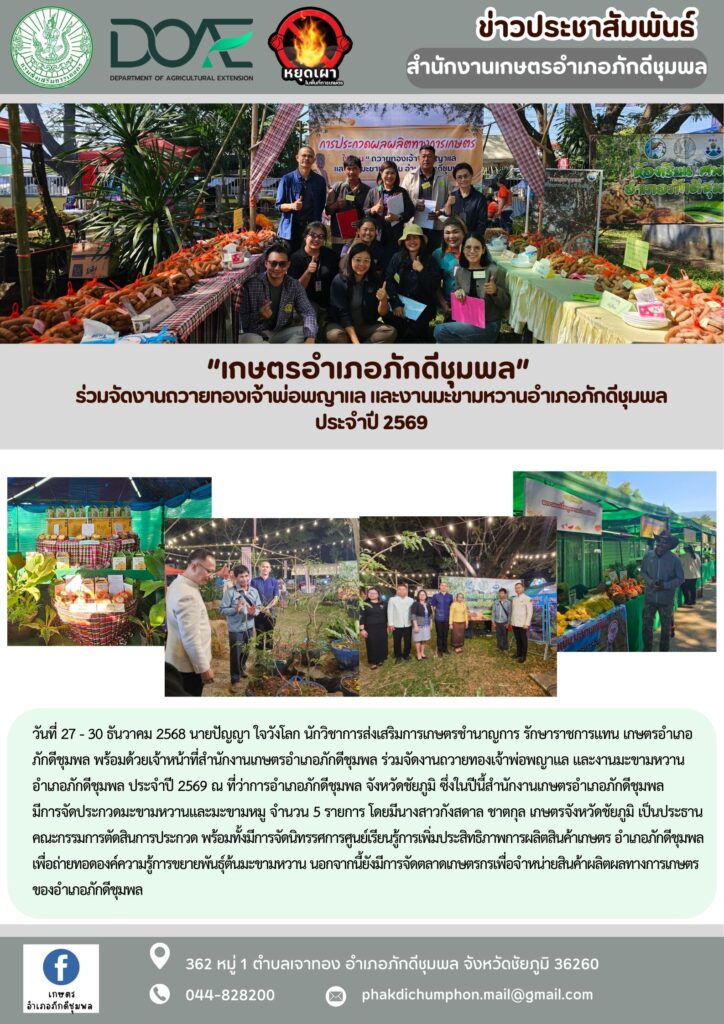 วันที่ 27 - 30 ธันวาคม 2568 นายปัญญา ใจวังโลก นักวิชาการส่งเสริมการเกษตรชำนาญการ รักษาราชการแทน เกษตรอำเภอภักดีชุมพล พร้อมด้วยเจ้าหน้าที่สำนักงานเกษตรอำเภอภักดีชุมพล ร่วมจัดงานถวายทองเจ้าพ่อพญาแล และงานมะขามหวานอำเภอภักดีชุมพล ประจำปี 2569 ณ ที่ว่าการอำเภอภักดีชุมพล จังหวัดชัยภูมิ ซึ่งในปีนี้สำนักงานเกษตรอำเภอภักดีชุมพล มีการจัดประกวดมะขามหวานและมะขามหมู จำนวน 5 รายการ โดยมีนางสาวกังสดาล ชาตกุล เกษตรจังหวัดชัยภูมิ เป็นประธานคณะกรรมการตัดสินการประกวด พร้อมทั้งมีการจัดนิทรรศการศูนย์เรียนรู้การเพิ่มประสิทธิภาพการผลิตสินค้าเกษตร อำเภอภักดีชุมพล เพื่อถ่ายทอดองค์ความรู้การขยายพันธุ์ต้นมะขามหวาน นอกจากนี้ยังมีการจัดตลาดเกษตรกรเพื่อจำหน่ายสินค้าผลิตผลทางการเกษตรของอำเภอภักดีชุมพล