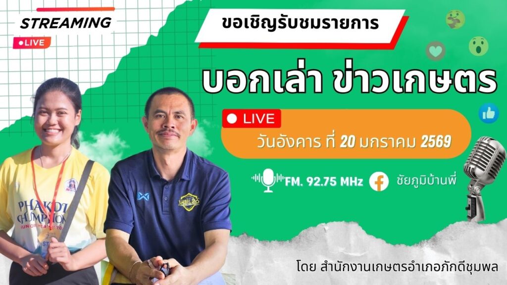 วันที่ 20 มกราคม 2569 เวลา 09.00 น. นายปัญญา ใจวังโลก นักวิชาการส่งเสริมการเกษตรชำนาญการ รักษาราชการแทน เกษตรอำเภอภักดีชุมพล พร้อมด้วยเจ้าหน้าที่สำนักงานเกษตรอำเภอภักดีชุมพล ร่วมจัดรายการวิทยุ รายการ “บอกเล่า ข่าวเกษตร” เพื่อเผยแพร่ข่าวสารด้านการเกษตร และการปฏิบัติงานของเกษตรอำเภอภักดีชุมพล โดยเผยแพร่ผ่านคลื่นวิทยุ FM 92.75 MHz และ Facebook Live เพจชัยภูมิบ้านพี่ ณ สถานีวิทยุกระจายเสียงแห่งประเทศไทย จังหวัดชัยภูมิ