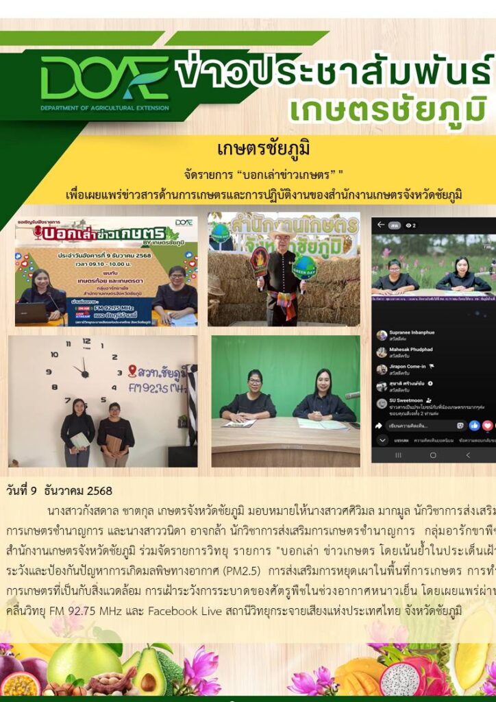 เกษตรชัยภูมิ ร่วมจัดรายการวิทยุ รายการ “บอกเล่า ข่าวเกษตรโดยเน้นย้ำในประเด็นเฝ้าระวังเเละป้องกันปัญหาการเกิดมลพิษทางอากาศ (PM2.5)