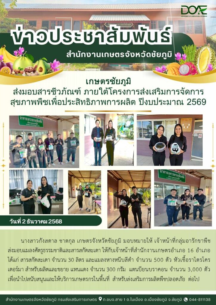 เกษตรชัยภูมิ ส่งมอบแมลงศัตรูธรรมชาติและสารสกัดสะเดา ให้กับเจ้าหน้าที่สำนักงานเกษตรอำเภอ 16 อำเภอ