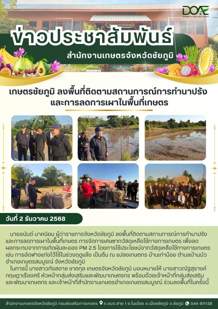 เกษตรชัยภูมิ ติดตามสถานการณ์การทำนาปรัง และการลดการเผาในพื้นที่เกษตร การจัดการเศษซากวัสดุเหลือใช้ทางการเกษตร เพื่อลดผลกระทบจากการเกิดฝุ่นละออง PM 2.5