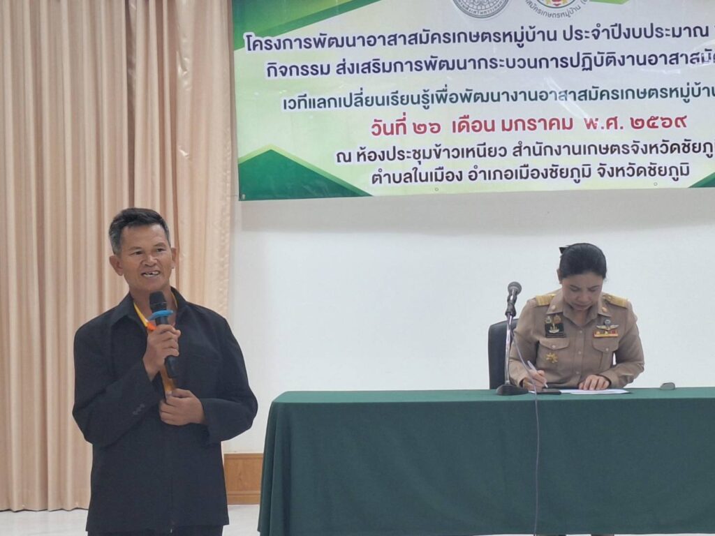 ในการนี้ นางสาวกังสดาล ชาตกุล เกษตรจังหวัดชัยภูมิ กล่าวรายงาน วัตถุประสงค์การจัดงาน โดยมีนายบุญช่วย ผ่านอ้น หัวหน้าสำนักงานจังหวัดชัยภูมิ เป็นประธานในพิธี โดยคณะวิทยากรประกอบด้วย นายมนตรี เยี่ยมสูงเนิน ประธานเครือข่ายวิสาหกิจชุมชนโคราชรักกัญช์ และนายศุภมิตร พิพิทธยนันท์ ประธาน อกม. อำเภอประทาย จังหวัดนครราชสีมา พร้อมคณะ ร่วมจัดเวทีเสวนา “องค์ความรู้และทักษะที่เกี่ยวข้องกับการปฏิบัติงานอาสาสมัครเกษตร” ทั้งนี้มี อาสาสมัครเกษตรหมู่บ้าน เข้าร่วมทั้งหมด 160 ราย