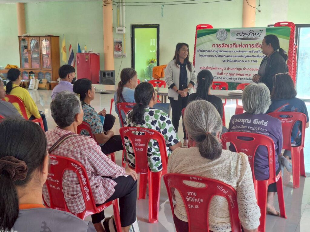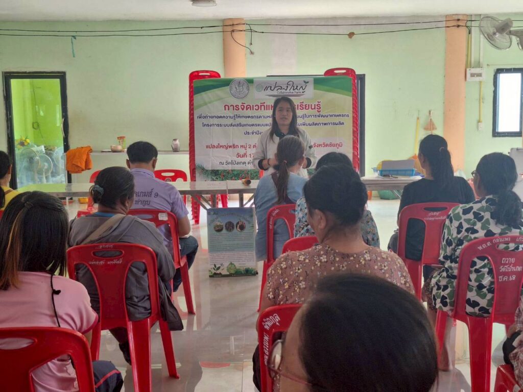 นางสาวไฉทยา เพชรบูลย์ เกษตรอำเภอซับใหญ่ พร้อมด้วยเจ้าหน้าที่สำนักงานเกษตรอำเภอซับใหญ่ จัดเวทีแห่งการเรียนรู้ภายใต้โครงการระบบส่งเสริมเกษตรแบบแปลงใหญ่เพื่อปรับเพิ่มผลิตภาพการผลิต ให้แก่กลุ่มแปลงใหญ่พริกหมู่ 2 ตำบลท่ากูบ อำเภอซับใหญ่ จังหวัดชัยภูมิ โดยมีเกษตรกรต้นแบบ Young Smart Farmer (YSF) น.ส.ศุภาวณี รวดชัยภูมิ เป็นวิทยากรให้ความรู้เรื่องการบริหารจัดการแปลงพืชผัก การตลาด การใช้เทคโนโลยีการผลิต และการสร้างแรงบันดาลใจในการทำการเกษตร นอกจากนี้ยังมีฝึกปฏิบัติการทำปุ๋ยหมักแบบไม่กลับกอง การเรียนรู้เรื่องประโยชน์ไบโอชาร์และการผลิตสารชีวภัณฑ์ไตรโคเดอร์มาเพื่อให้เกษตรกรสามารถนำไปปรับใช้ในพื้นที่ของตนเองได้อย่างมีประสิทธิภาพ พร้อมทั้งประชาสัมพันธ์การหยุดเผาในพื้นที่การเกษตร ณ วัดโป่งเกต หมู่ 2 ตำบลท่ากูบ อำเภอซับใหญ่ จังหวัดชัยภูมิ