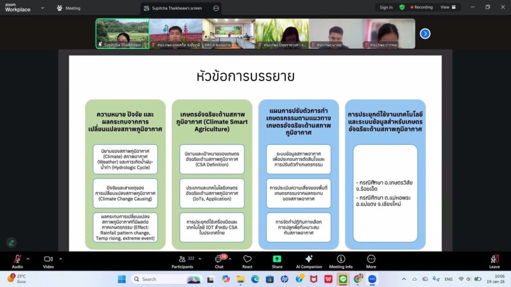 นายพรชัย ทุราช เกษตรอำเภอเทพสถิต มอบหมายให้ นายรัชชานนท์ ทิมเมฆ นักวิชาการส่งเสริมการเกษตรปฏิบัติการ ร่วมสัมมนาขับเคลื่อนการใช้แผนที่เกษตรเพื่อการบริหารจัดการเชิงรุก (Agri – Map) ระดับเขต ปี 2569 (ออนไลน์) ระหว่างวันที่ 19 – 20 มกราคม 2569 เพื่อพัฒนาศักยภาพเจ้าหน้าที่ให้มีความรู้ความเข้าใจในการใช้ประโยชน์จากแผนที่เกษตร เพื่อการบริหารเชิงรุก (Agri – Map) ดำเนินโครงการปรับเพิ่มผลิตภาพการใช้ประโยชน์ที่ดินและทรัพยากร ตามแผนที่เกษตรเพื่อการบริหารเชิงรุก ปี 2569 ให้เป็นไปในแนวทางเดียวกัน โดยมี นายกมล โสพัฒน์ ผู้อำนวยการสำนักงานส่งเสริม และพัฒนาการเกษตรเขตที่ 4 จังหวัดขอนแก่น เป็นประธานในการเปิดสัมมนาดังกล่าว ผ่านระบบ Zoom Meeting ณ สำนักงานเกษตรอำเภอเทพสถิต จังหวัดชัยภูมิ