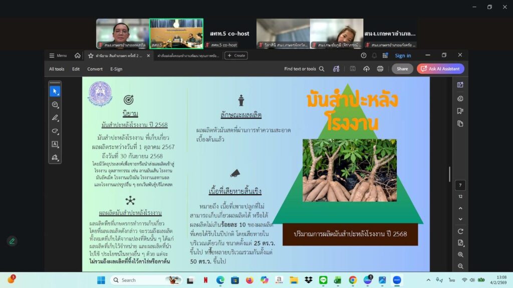 นายพรชัย ทุราช เกษตรอำเภอเทพสถิต พร้อมด้วย นายเจนภพ ทองรักษ์ นักวิชาการส่งเสริมการเกษตร ประชุมคณะทำงานพัฒนาคุณภาพข้อมูลปริมาณการผลิตสินค้าเกษตรด้านพืช ภาคตะวันออกเฉียงเหนือ (จังหวัดชัยภูมิ) ครั้งที่ 2/2568 เพื่อพิจารณาข้อมูล ปริมาณการผลิต (ข้าวนาปรัง มันสำปะหลังโรงงาน ปี 2568 ข้าวโพดเลี้ยงสัตว์ รุ่น 1 ข้าวโพดเลี้ยงสัตว์ รุ่น 2 ถั่วเหลือง รุ่น 1 ถั่วเหลือง รุ่น 2 ปีเพาะปลูก 2567/68 ลำไย ลิ้นจี่ และทุเรียน ปี 2568) จังหวัดชัยภูมิ ผ่านระบบออนไลน์ Zoom Meeting ณ สำนักงานเกษตรอำเภอเทพสถิต จังหวัดชัยภูมิ