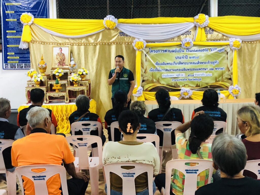 นายพรชัย ทุราช เกษตรอำเภอเทพสถิต พร้อมด้วยนายรัชชานนท์ ทิฆเมฆ นักวิชาการส่งเสริมการเกษตรปฏิบัติการ ร่วมออกให้บริการตามโครงการตำบลยั่งยืน (Sustainable Village) เพื่อเฉลิมพระเกียรติ พระบาทสมเด็จพระเจ้าอยู่หัวเนื่องในโอกาสมหามงคลเฉลิมพระชนมพรรษา 72 พรรษา เพื่อขับเคลื่อนการดำเนินงานพัฒนาหมู่บ้านในพื้นที่ตำบลห้วยยายจิ๋ว ให้เป็นหมู่บ้านยั่งยืน (Sustainable Village) โดยมี นายวรวิทย์ นามมหานวล นายอำเภอเทพสถิต เป็นประธานในการเปิดโครงการดังกล่าว ณ ศาลากลางบ้าน บ้านเมืองทอง หมู่ที่ 14 ตำบลห้วยยายจิ๋ว อำเภอเทพสถิต จังหวัดชัยภูมิ